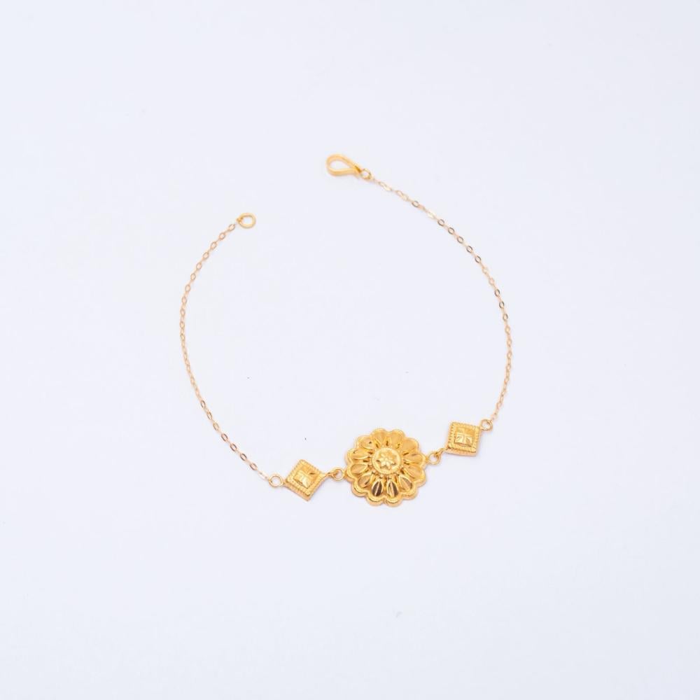 سلسلة رفيعة تتوسطها زهرة ذهبية متألقة يحيط بها زخرف مربع فاخر على الجانبين، لتمنحك إطلالة أنثوية مليانة تميّز.