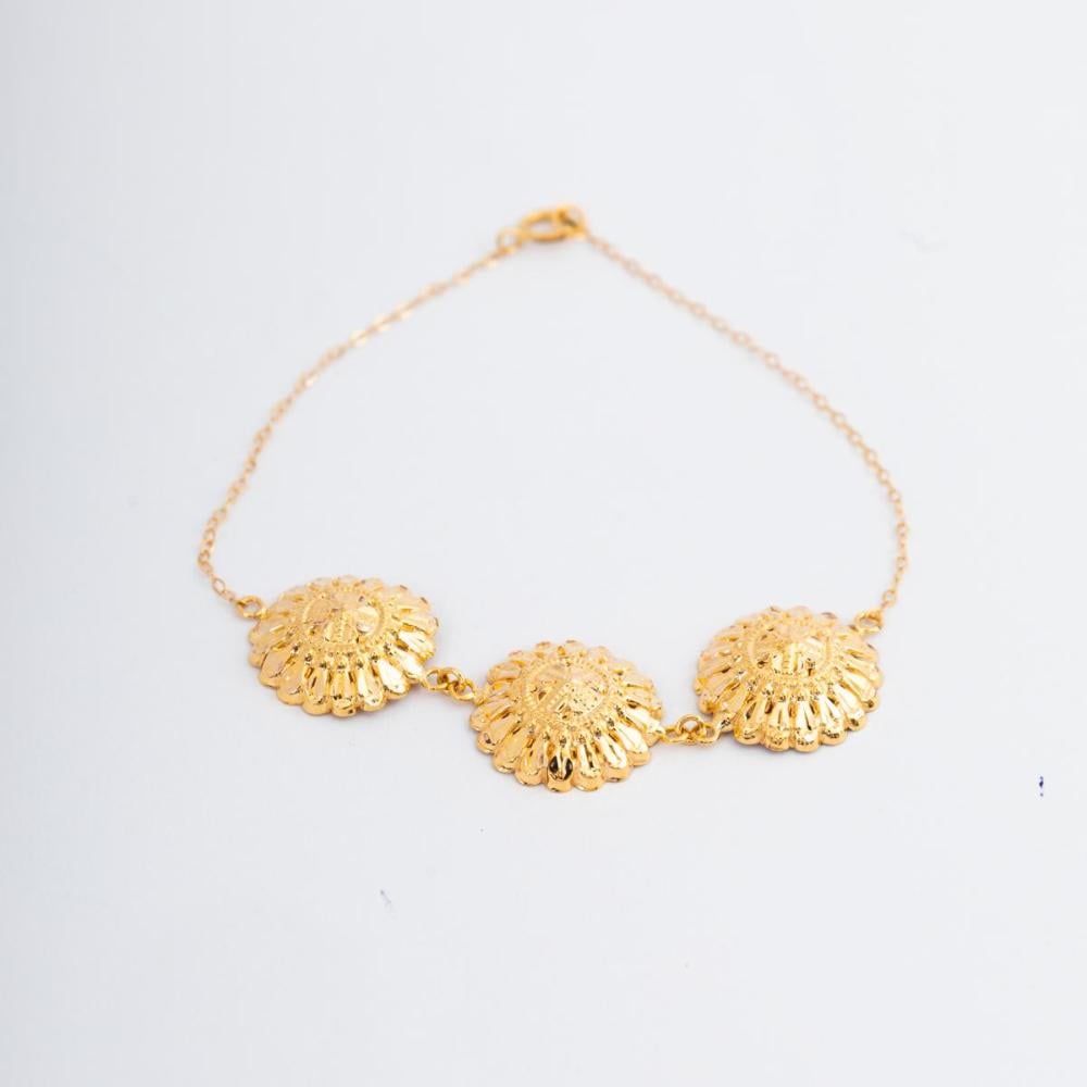 سوار كرسي جابر بتصميم فاخر مصنوع من الذهب الخالص عيار 21، يجمع بين الحرفة التقليدية والجمال العصري ✨ يتميز بثلاث حليات دائرية منقوشة بزخارف بارزة تمنح السوار مظهرًا ملوكيًا فريدًا يعكس فخامة الذهب وأصالته. قطعة تعبّر عن الأناقة الكلاسيكية وتكمّل إطلالتك الذهبية بكل رُقي 💛