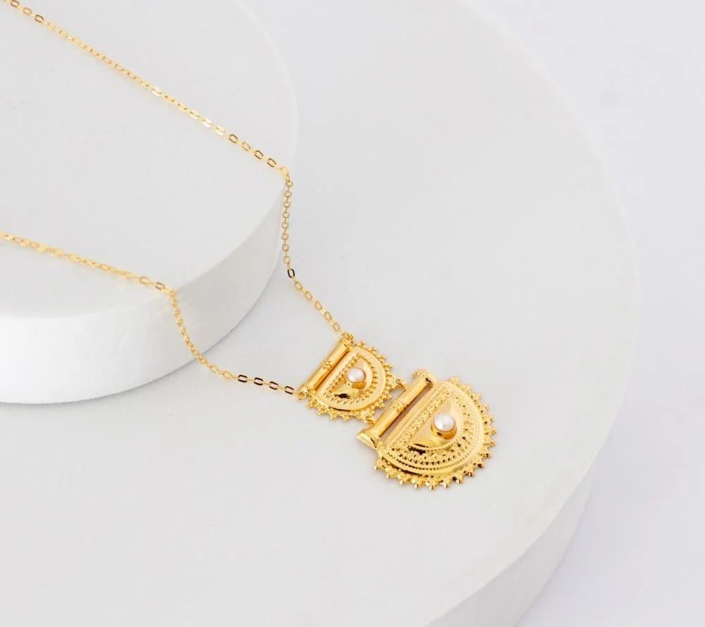 عقد براشي فاخر مصنوع من الذهب الخالص عيار 21، يتميز بتصميم مزدوج على شكل نصف دائرة مزخرفة بتفاصيل دقيقة تتوسطها لمسة لؤلؤية أنيقة ✨ قطعة تجمع بين التراث العربي الأصيل والفخامة الحديثة لتمنحك إطلالة ملكية تلفت الأنظار 💛