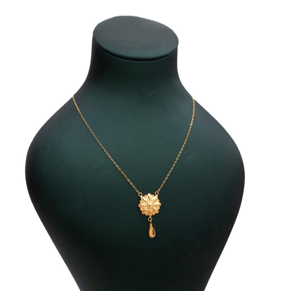 سلسلة ذهبية رفيعة بلمعة راقية، تتوسطها دائرة مزخرفة تحاكي إشراقة الشمس، يتدلّى منها بريق أنيق يجعل الإطلالة أكثر سحرًا.