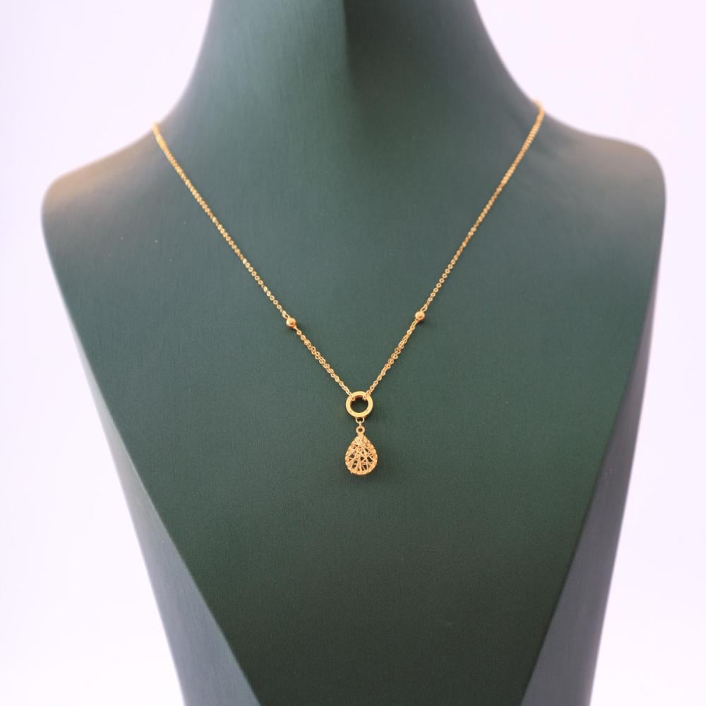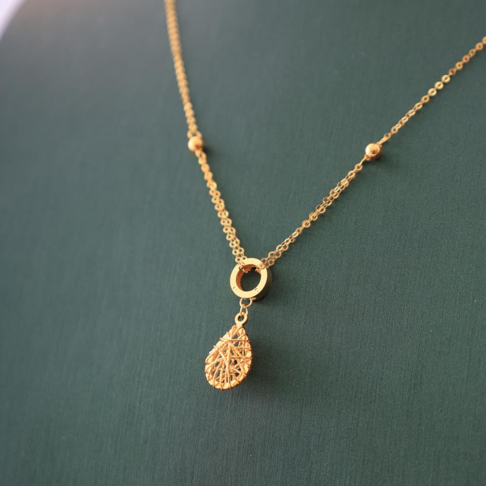 A luxurious gold necklace crafted from 21-karat pure gold, featuring an intricately engraved drop design hanging from an elegant gold ring, adding a touch of softness and luxury to your look.