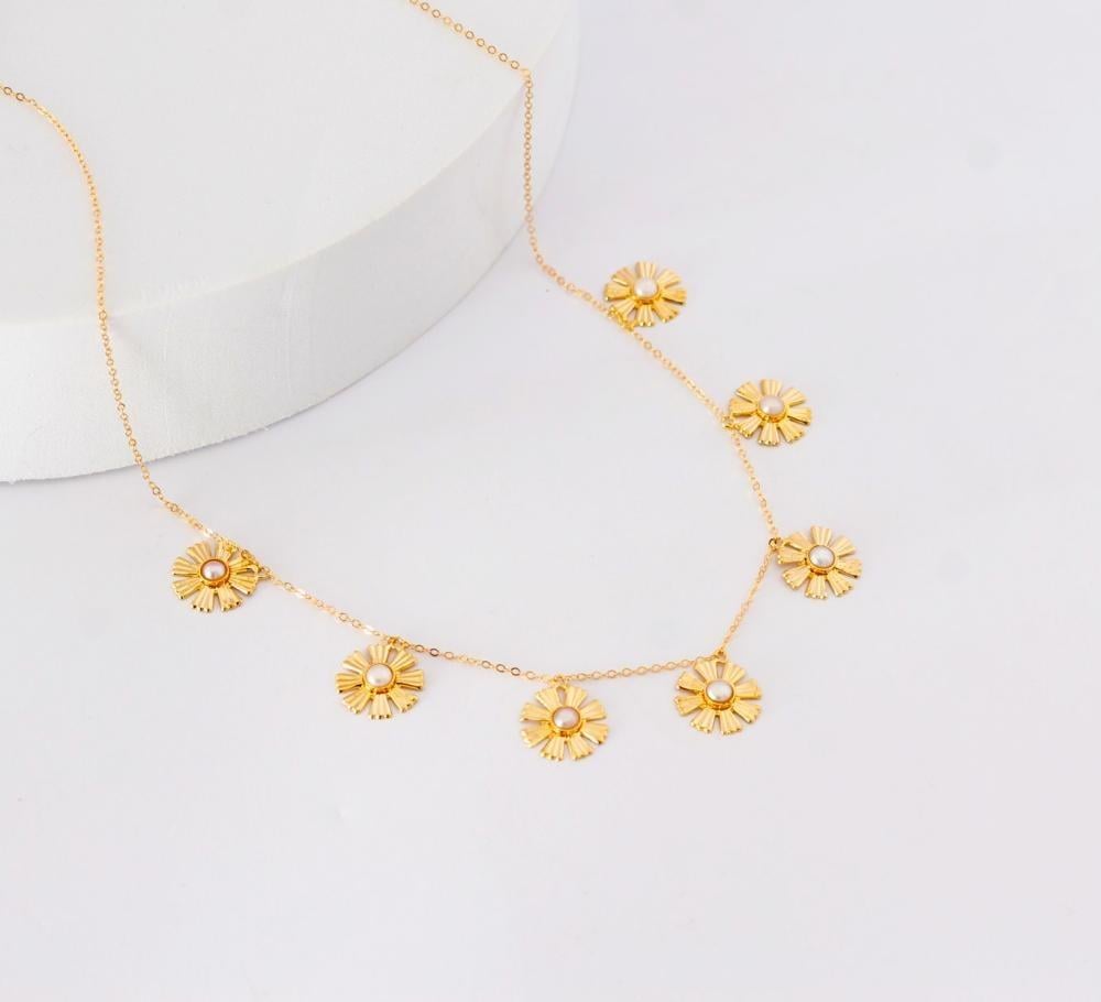A luxurious gold necklace from the Al-Barashi collection with a feminine, elegant design crafted from pure 21-karat gold. The necklace features a chain adorned with several circular flower-like motifs, accented with delicate touches that give it a distinctive sparkle and eye-catching shine. ✨ Its modern design with a traditional touch makes it an ideal choice for every elegant look, whether for special occasions or for everyday use. 💎