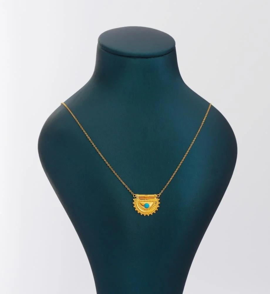 A delicate mini Brashi necklace crafted in 21-karat pure gold, adorned with a small semicircular pendant with a turquoise stone in the middle, adding a distinctive shine. ✨ Its simple and elegant design makes it an ideal choice for everyday looks and for those who prefer quiet elegance. 💛